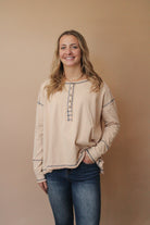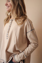Get ready to elevate your casual style with the Rachelle Stitched Henley! Crafted from garment washed cotton, this top features defined stitching accents and functional buttons. The raw edge detail adds a touch of edginess to this otherwise classic piece. Perfect for a laid-back yet stylish look.